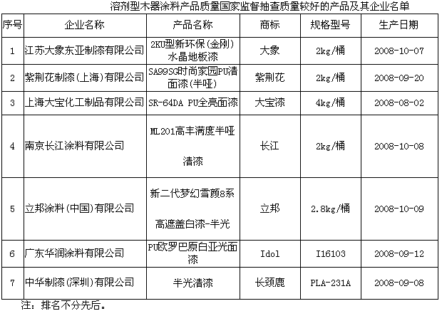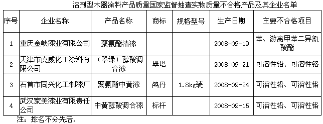 溶劑型木器涂料:抽查了北京、天津、上海、江蘇、浙江、安徽、山東、廣東、福建、湖北、四川、湖南、重慶、江西、廣西15個省、直轄市、自治區213家企業生產的213種產品,產品實物質量合格率為98.1%。這次抽查,重點對溶劑型木器涂料的揮發性有機化合物、苯、甲苯和二甲苯總和、游離甲苯二異氰酸酯、重金屬等項目進行了檢驗。抽查中發現的主要質量問題是可溶性鉛、可溶性鉻、苯、游離甲苯二異氰酸酯不合格。