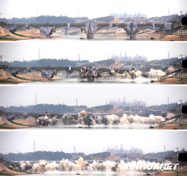 這是廖家渡大橋爆破拆除過程的拼版照片(3月17日攝)。3月17日,橫跨長沙市撈刀河上的長湘公路廖家渡大橋成功爆破拆除。長湘公路廖家渡大橋長194米,橋面寬9米,為鋼筋混凝土四跨雙曲拱橋,跨徑40余米,始建于20世紀70年代初。2008年11月,廖家渡大橋出現橋墩間拱肋斷裂現象,為防止意外事故出現,長沙市對該橋實行封閉,并決定拆除重建。這次爆破采用分段微差起爆方式,從南向北分9段依次起爆,用時3秒。