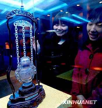 3月19日,兩名游客在圣時水晶博物館內觀賞水晶工藝品。