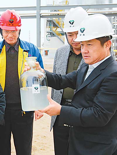 伊泰集團總經理張東海展示煤間接液化生產的第一桶油。(宋海靖