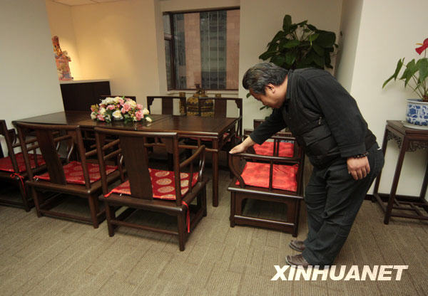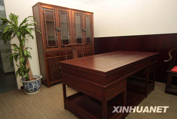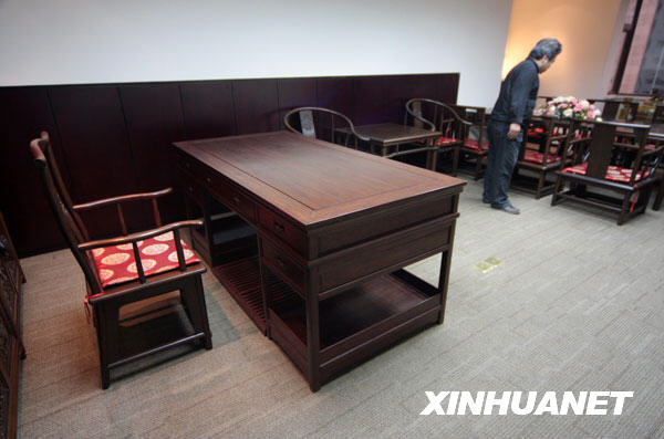 3月23日拍攝的展出的“羅格奧運辦公家具”。據悉,國際奧委會主席羅格在北京奧運會期間使用過的20件仿古風格辦公家具將于3月底在北京拍賣。這套辦公家具以竹子為主料,包括書桌、官帽椅、書柜、會議桌椅、花幾、電視柜、圈椅等。