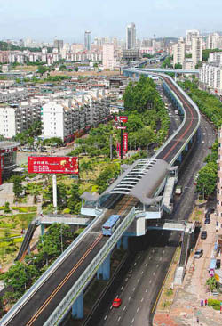 沿著輕捷的自動扶梯,記者3月24日一早登上離地面9米的空中巴士站。BRT一號線起點站,與鼓浪嶼渡口相鄰,如上海外灘,客流稠密。8時30分,一輛長12米的藍色BRT專用巴士穩穩入站,車門打開的瞬間,乘客隊伍前的感應柵欄悄然打開,上方的電子顯示牌同時顯示出下兩趟車的發車時間。司機告訴記者,巴士由金龍客車量身定做,先進的強制限速器,控制時速60公里,全程勻速行駛,平行?空九_,誤差不超5厘米。車上5個攝像頭,車頭前有“黑匣子”,行車數據全記錄。 透過今天BRT新型、快速、現代、智能、美觀的“五高”目標,記者不由要去探尋它“低能耗、低污染、低投入、低占地和低出行費用”的選擇背景! 緩解交通難,廈門最初的指向是建地鐵或輕軌,理由是作為海峽西岸中心城市,建設要有前瞻性。 然而,端著年財政收入220億元的盤子,市委、市政府反復算賬:每公里道路造價,地鐵5億—6億元,輕軌1.5億—2億元,廈門地質結構復雜,建地鐵難度大、周期長、投資成本高、客流量不足、運營成本過高!輕軌亦然。經過反復調研,大運量、快捷、準時、舒適、安全、低能耗、低污染的BRT浮出水面。BRT建設運營成本僅為軌道交通的1/10;更重要的是,作為不足300萬人口的城市,快速公交系統完全可以解決目前甚至今后相當長一段時期的群眾出行難題。 那么,可以讓百姓、政府、環境同時受惠的“五低”方案,能不能瞄準“五高”目標,能不能贏得市民高滿意率呢?廈門在落實科學發展觀的過程中全力求解。經過反復的學習、調研,爭論、碰撞,廈門市委、市政府最終形成了“一種選擇、兩項創新”的決策。 選擇興建快速公交系統!為解決公交車與社會車輛爭道矛盾,廈門創新模式,市區采用全路段高架模式,公交車享有全封閉專用路權,無紅綠燈,確?焖、準點、安全;為解決現在適用與將來發展的矛盾,BRT的道路和站臺設計,采用升級輕軌的標準,為未來改造預留空間,預算由此增加了2個億,廈門人說:值!