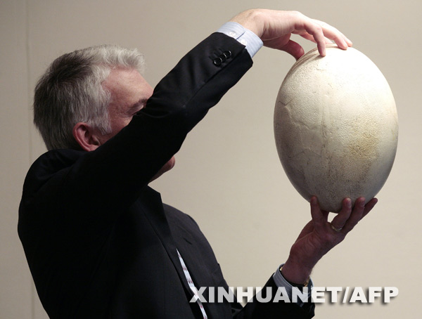 3月25日,一名男子在英國倫敦展示一枚據稱是“世界上最大的蛋”。這枚由已經滅絕的馬達加斯加象鳥在十七世紀產下的蛋,將在當天舉行的切爾西古董展上出售,標價5000英鎊(約合7340美元)。新華社/法新