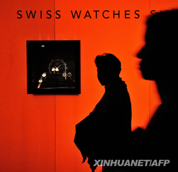 3月25日,在瑞士北部城市巴塞爾舉行的2009巴塞爾名表珠寶展媒體開放日上,一名參觀者的影子反射在展廳的玻璃墻上。新華社/法新 |
