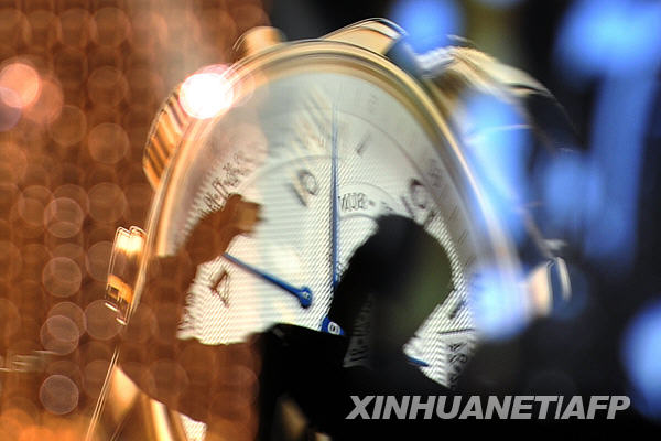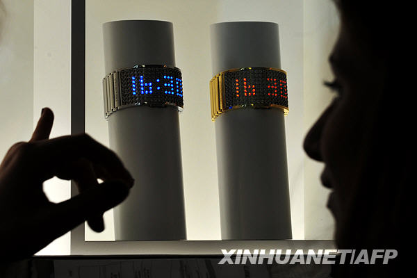 3月25日,在瑞士北部城市巴塞爾舉行的2009巴塞爾名表珠寶展媒體開放日上,一名參觀者欣賞施華洛世奇(Swarovski)水晶表。新華社/法新 |