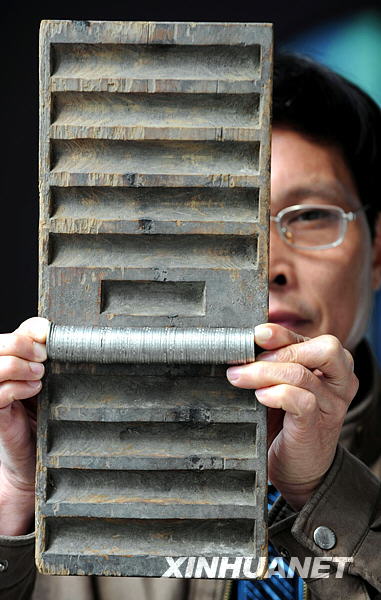 3月26日,福建省尤溪縣文物普查員謝慶添展示一塊木制清代“點鈔機”。據介紹,這塊清代使用的“點鈔機”狀似算盤,長37厘米,寬16厘米,內刻有11條凹槽,直徑同當時流通的銅幣直徑吻合,其中10條長凹槽可一次性勘驗1000枚銅幣,中部的一條短凹槽可勘驗50枚銅幣。