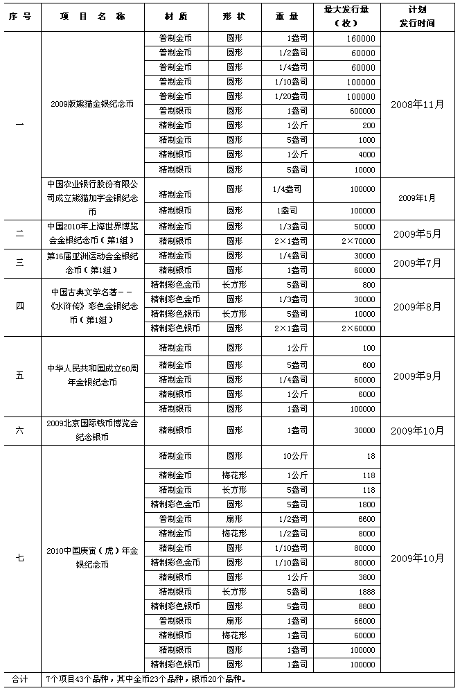 這7個項目分別為:2009版熊貓金銀紀念幣(其中包含中國農業銀行股份有限公司成立熊貓加字金銀紀念幣)、中國2010年上海世界博覽會金銀紀念幣(第1組)、第16屆亞洲運動會金銀紀念幣(第1組)、中國古典文學名著——《水滸傳》彩色金銀紀念幣(第1組)、中華人民共和國成立60周年金銀紀念幣、2009北京國際錢幣博覽會紀念銀幣、2010中國庚寅(虎)年金銀紀念幣。上述項目中,2009版熊貓金銀紀念幣已于2008年11月發行。