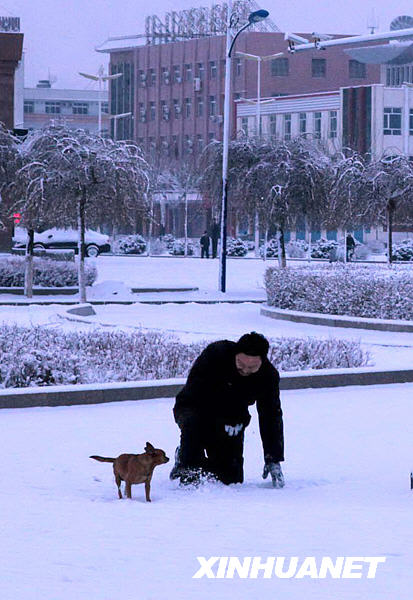 3月30日清晨,一位烏蘭浩特市民在雪中遛狗。新華社發(李德 攝)