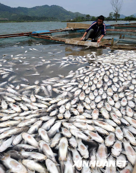 3月29日,一位農民痛心地捧著已死的魚。新華社記者:陳瑞華 攝
