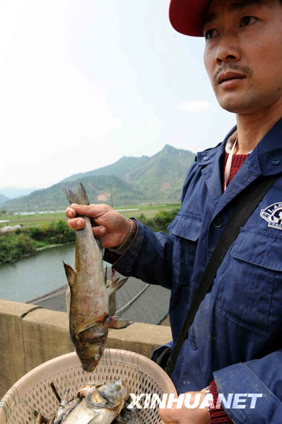 3月29日,返鄉創業的廣福村農民黃志剛痛心地拿著已死的魚。新華社記者:陳瑞華 攝 |
