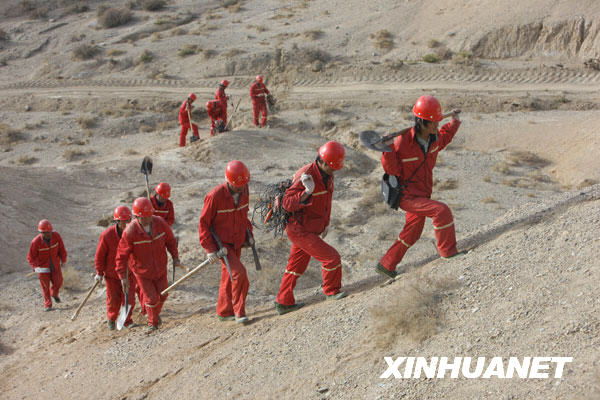 3月29日,中國石油東方物探公司塔里木經理部的工人在進行物探作業。新華社記者:邢廣利攝