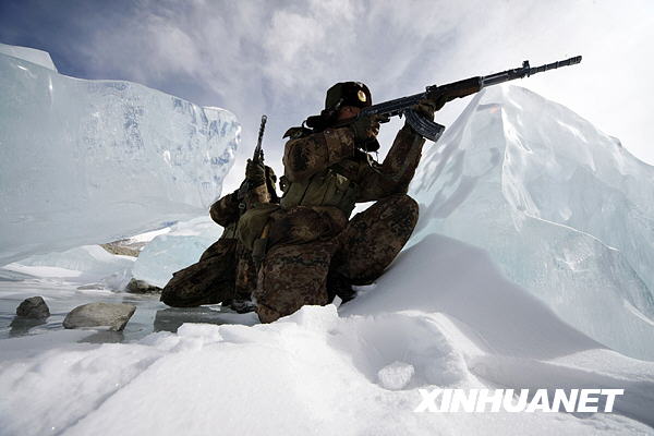 3月22日,官兵們巡邏在海拔7546米的幕士塔格峰。 |