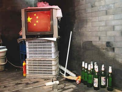 北京一處胡同小賣鋪外的電視里,中華人民共和國國旗正在頒獎儀式上冉冉升起。