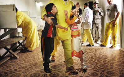 在科威特與伊拉克邊境附近的布卡關押中心,伊拉克囚犯的孩子來探視時緊抱住他們的父親。