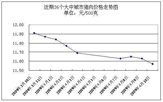 據國家發展改革委價格監測中心監測,上周(2009.4.7-2009.4.10,下同)36個大中城市集市、超市豬肉(精瘦肉)平均零售價格每500克為11.62元,與前一周(2009.3.30-2009.4.3,下同)相比下降1.69%。