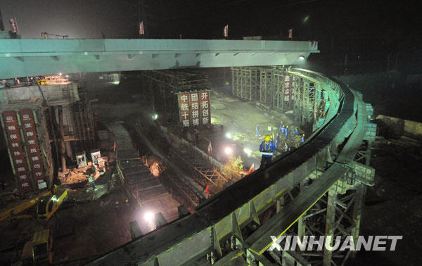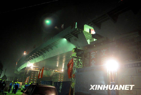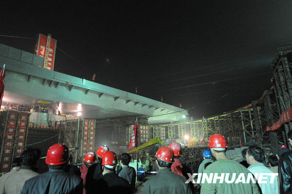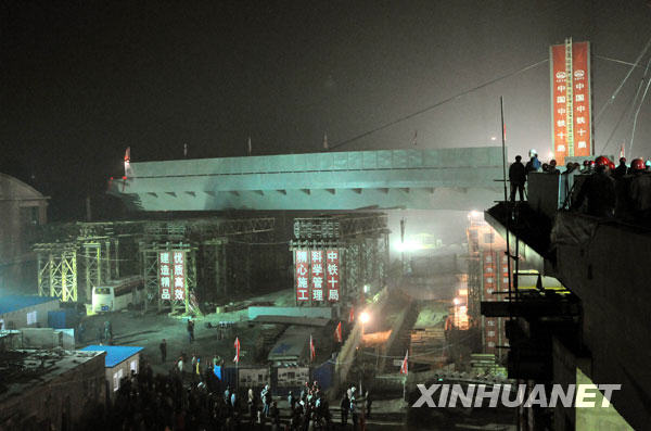 當日凌晨1點55分,經過一個多小時的緊張工作,由中國中鐵十局承建的石家莊和平路高架橋跨鐵路鋼箱梁成功旋轉86度角,與鐵路兩側的橋梁實現成功對接。