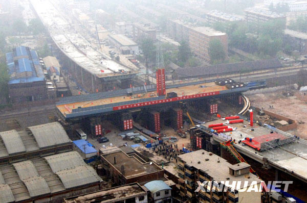 轉體前的石家莊和平路跨鐵路橋(4月14日攝)。