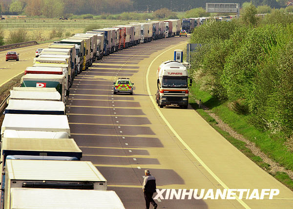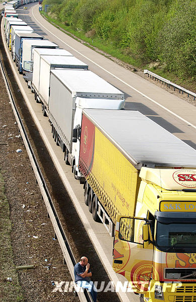4月15日,在英國南部肯特郡的阿什福德附近,等待通過渡口的貨車排起長龍。新華社/法新