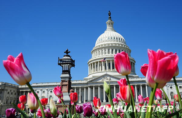4月16日,郁金香在美國首都華盛頓國會山前綻放。
