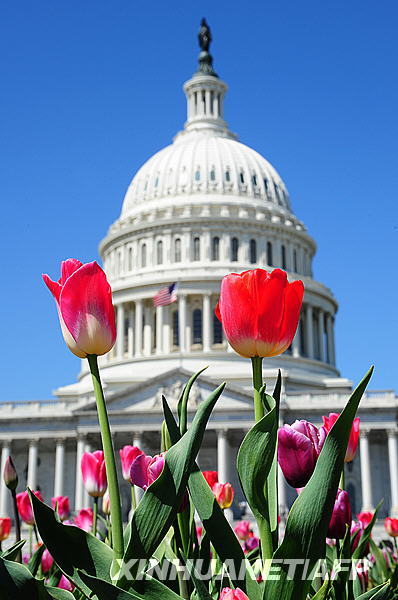 4月16日,郁金香在美國首都華盛頓國會山前綻放。雨后春日的陽光和溫暖的氣候讓國會山前的郁金香得以盛開。