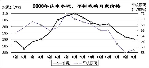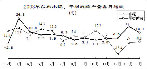 水泥、平板玻璃價格低位波動。3月份,重點建材企業水泥平均出廠價為290元/噸,比2月份回落2元/噸,降至2008年4月份水平,同比上漲2元/噸;平板玻璃出廠價59元/重量箱,比2月份回升1元/重量箱,同比回落10元/重量箱。3月末,重點建材企業水泥庫存1226萬噸,同比上升19.1%;平板玻璃庫存2084萬重量箱,下降14.6%。