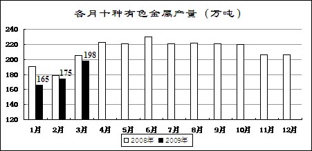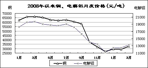 受國家收儲政策、企業大量停產減產等影響,主要有色金屬價格有所回升。3月份,國內市場銅、電解鋁、鉛、鋅現貨平均價分別為32543元/噸、13261元/噸、12813元/噸和11735元/噸,比去年12月份回升21.3%、18.9%、22.5%和19.8%,同比下降51%、32.7%、40.9%和43.3%。