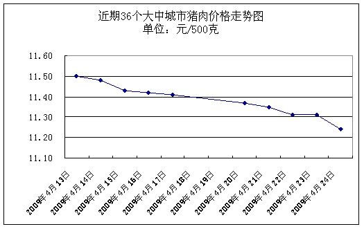 據國家發展改革委價格監測中心監測,上周36個大中城市集市、超市豬肉(精瘦肉)平均零售價格每500克為11.32元,與前一周(2009.4.13-2009.4.17,下同)相比下降1.14%。 牛肉、羊肉、雞肉、雞蛋、草魚、鰱魚集市、超市平均零售價格每500克分別為18.01元、17.84元、7.99元、3.63元、7.58元、5.68元,與前一周相比,牛肉價格下降0.17%,雞肉、雞蛋、草魚、鰱魚價格分別上漲0.25%、0.83%、0.40%、0.71%,羊肉價格持平。