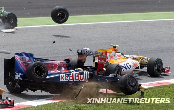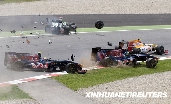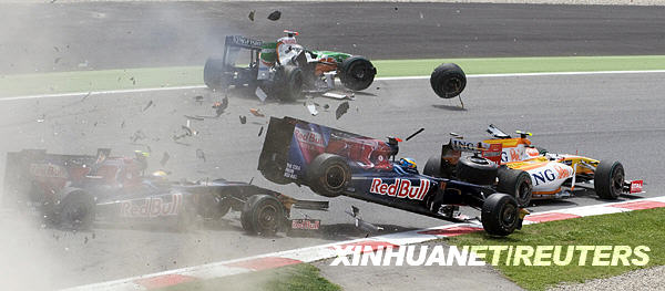 5月10日,紅牛二隊車手布爾代(前中)和隊友布埃米(前左)以及印度力量車隊車手蘇蒂爾(后)、雷諾車隊車手皮蓋駕駛的賽車發生碰撞。當日,F1西班牙大獎賽落幕,布朗GP車隊的英國車手巴頓奪得冠軍。新華社/路透