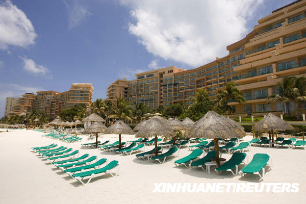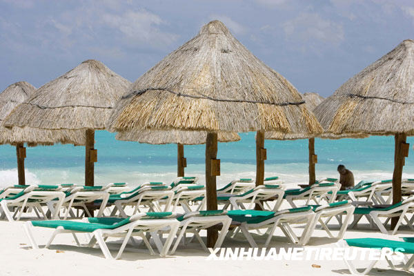 5月12日拍攝的照片顯示墨西哥旅游勝地坎昆海灘上見不到一個游客。甲型H1N1流感使墨西哥旅游業遭受重創。墨西哥地方官員11日說,游客銳減已迫使旅游勝地坎昆等地的25家酒店關門。墨旅游促進委員會公布最新預測稱,2009年墨西哥旅游業盈利將比2008年減少近三成。新華社/法新