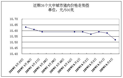 據國家發展改革委價格監測中心監測,2009年5月31日-2009年6月5日全國36個大中城市集市、超市豬肉(精瘦肉)平均零售價格每500克為10.57元,與前一周(2009.5.25-2009.5.27)相比下降0.38%。