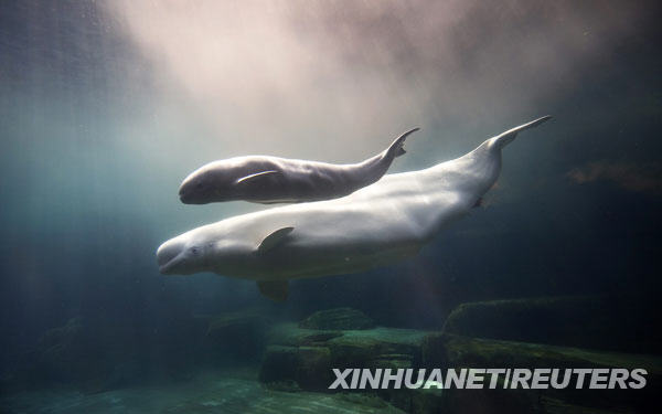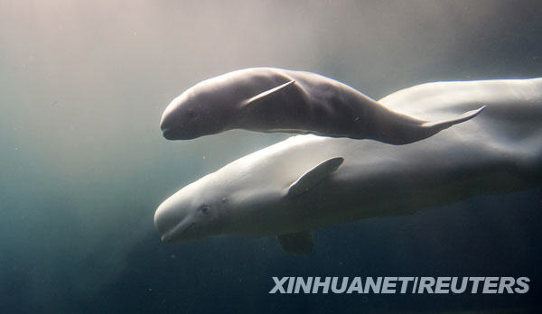 6月7日,在加拿大溫哥華水族館,二十歲的白鯨“極光”和她產下的幼崽在水中暢游。新華社/路透