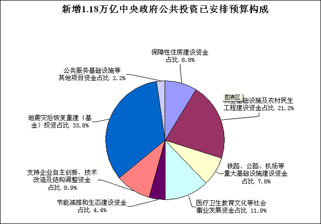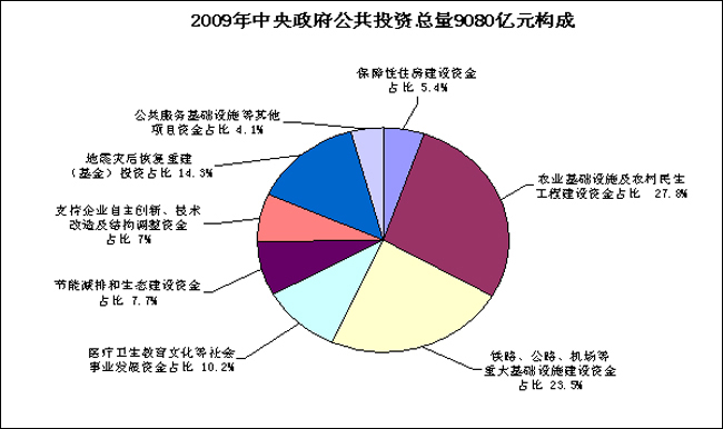 2008年四季度至2010年新增4萬億擴大內需投資中,新增中央政府公共投資1.18萬億元,其中:2008年四季度安排新增投資1040億元,2009年安排新增投資4875億元,2010年預計安排新增投資5885億元。 截至目前,1.18萬億元新增中央政府公共投資已安排資金5915億元,分項目情況如下:用于保障性住房建設資金522億元,占8.8%;農業基礎設施及農村民生工程建設資金1253億元,占21.2%;鐵路、公路、機場等重大基礎設施建設資金460億元,占7.8%;醫療衛生教育文化等社會事業發展資金703億元,占11.9%;節能減排和生態建設資金260億元,占4.4%;支持企業自主創新、技術改造及結構調整資金585億元,占9.9%;地震災后恢復重建(基金)投資2000億元,占33.8%;公共服務基礎設施等其他項目資金132億元,占2.2%。 此外,2009年中央政府公共投資預算總量為9080億元,比上年增加4875億元,分項目安排情況如下:用于保障性住房建設資金493億元,占5.4%;農業基礎設施及農村民生工程建設資金2522億元,占27.8%;鐵路、公路、機場等重大基礎設施建設資金2134億元,占23.5%;醫療衛生教育文化等社會事業發展資金926億元,占10.2%;節能減排和生態建設資金696億元,占7.7%;支持企業自主創新、技術改造及結構調整資金633億元,占7.0%;地震災后恢復重建(基金)投資1300億元,占14.3%;公共服務基礎設施等其他項目資金376億元,占4.1%。 中央政府公共投資無論是總量還是增量安排,均體現了保民生、保增長、保災后恢復重建和調結構的基本原則和政策取向,如用于民生工程和災后恢復重建資金比重,2009年中央政府公共投資9080億元中占57.7%,2008年四季度及2009年合計新增中央政府公共投資5915億元中占75.7%。