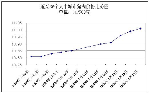 據國家發展改革委價格監測中心監測,上周(2009.7.13-2009.7.17,下同)36個大中城市集市、超市豬肉(精瘦肉)平均零售價格每500克為10.95元,與前一周(2009.7.6-2009.7.10,下同)相比上漲1.11%。