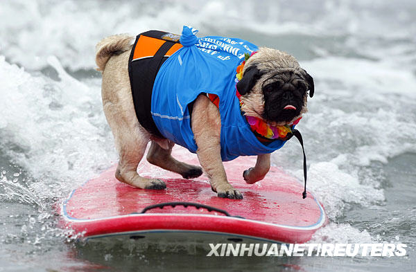 9月13日,在美國加利福尼亞州的德爾馬,一只6歲大的小狗體驗沖浪。當天,這里舉辦了一場狗狗沖浪大賽,旨在為流浪動物籌集善款并喚起人們對寵物的愛心和責任感。 |