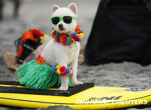 9月13日,在美國加利福尼亞州的德爾馬,一只裝扮入時的小狗等待參加沖浪比賽。當天,這里舉辦了一場狗狗沖浪大賽,旨在為流浪動物籌集善款并喚起人們對寵物的愛心和責任感。