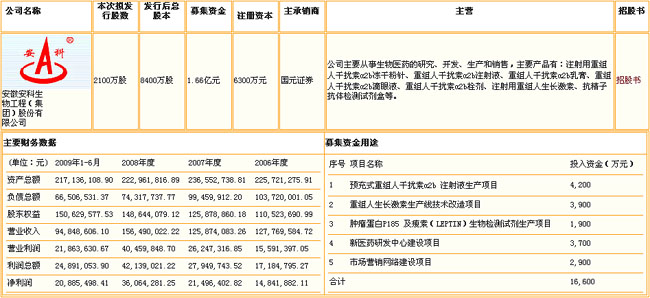 安徽安科生物工程(集團)股份有限公司主營重組人干擾素和重組人生長激素等生物藥品,擬發行2100萬股,募集資金16600萬元,發行后總股本不超過8400萬股。該公司今年上半年實現凈利潤2088.55萬元,每股收益0.33元。 安徽安科生物經營范圍:自行研制、生產的生物制品、醫藥(基因重組制品、凝膠劑)及其原料、生化制品的出口和與公司生產、科研相關的原輔材料、機械設備、儀表儀器與零部件的進口(特殊規定的除外);藥物、診斷試劑(體外診斷試劑)、生物技術和生化工程的原料及產品的研制、生產、銷售,技術轉讓、服務。