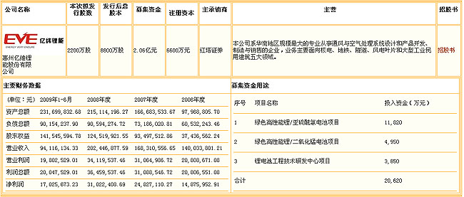 惠州億緯鋰能股份有限公司主營鋰亞電池、鋰錳電池、鋰離子和鋰聚合物電池、鎳氫電池等,擬發行2200萬股,募集資金20620萬元,發行后總股本不超過8800萬股。該公司今年上半年實現凈利潤1702.57萬元,每股收益0.26元。 公司主要服務于智能電網、射頻識別(RFID)、汽車電子(輪胎壓力監測系統和安全防盜系統)和安防產業(電子煙霧報警器)等領域,為上述領域提供高能量、長壽命、適用溫度范圍廣的新型環保鋰電池解決方案和產品。智能電表、智能識別卡、輪胎壓力監測系統、安全防盜系統和電子煙霧報警器等均是近年來快速成長的產業,這為公司的持續成長提供了廣闊的空間。