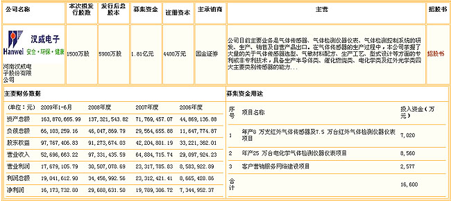 河南漢威電子股份有限公司主營氣體傳感器、氣體檢測儀器儀表和氣體檢測控制系統,擬發行1500萬股,募集資金18157萬元,發行后總股本不超過5900萬股。該公司今年上半年實現凈利潤1617.37萬元,每股收益0.37元。 公司研究、開發、生產、銷售電子傳感器;電子監控技術開發;研究、開發、生產、銷售檢測儀器及控制系統、機械電器設備、防爆電氣系列產品;提供技術轉讓、技術服務、技術咨詢;計算機軟件開發與銷售;計算機網絡工程施工;防爆設備安裝工程施工(以上憑資質證經營);經營本企業自產產品的出口業務和本企業所需的機械設備、零配件、原輔材料的進口業務,但國家限定公司經營或禁止進出口的商品除外。