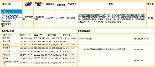 萊美藥業以研發、生產和銷售新藥為主,產品主要涵蓋抗感染類和特色?朴盟巸纱笙盗,主要產品有喹諾酮類抗感染藥、抗腫瘤藥、腸外營養藥等。 招股說明書顯示,萊美藥業2009年上半年營業收入為1.52億元,凈利潤為1798.72萬元,基本每股收益0.25元,歸屬于發行人股東的每股凈資產2.23元,全面攤薄凈資產收益率11.28%。資產負債率(合并報表口徑)46.43%。 次募集資金扣除發行費用后,公司擬將募集資金投向抗感染及特色?朴盟幃a業化生產基地建設項目,該項目總投資額為14,422.30萬元。如果本次發行實際募集資金量不能滿足上述項目資金需求,不足部分由公司自籌解決;如本次發行實際募集資金量超過項目的資金需求量,公司擬將富余的募集資金主要用于補充募投項目建設和生產所需要的流動資金。 如募集資金在補充完上述募集資金投資項目的流動資金后仍有余額,則將用于補充公司經營所需的流動資金、償還銀行貸款。 目前,邱宇是萊美藥業的控股股東、實際控制人。本次發行前,邱宇先生持有公司2,063.90萬股股份,占公司總股本的30.13%。自然人股東43人,其中31人為中高層核心管理人員和業務骨干。 截至本招股書簽署日,邱宇除持有萊美藥業30.13%的股權外,還持有藥友科技32.67%的股權。