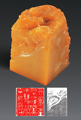 880,000 拍賣公司:上海敬華 日期:2001-12-15 說明:田黃章料,方正大器,通體質地細膩勻凈潤澤,頂部浮雕云龍紋,龍圓眼外凸,鼻翼上翅,體態健碩,為田黃印章中難得的精品。