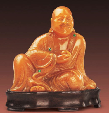"黃金易得,田黃難求。"此件依田黃石材料巧妙雕制成羅漢像,光頭﹑坦胸﹑一手扶地,一手捧佛珠,身披袈裟,上嵌寶石,神情肅然,舉止端莊?坦ち鲿畅p精致,入手極感舒暢,撫摩久之,則益加不忍釋手,心﹑石相契?芍^"田石羅漢無量壽,來結人間百歲緣。"