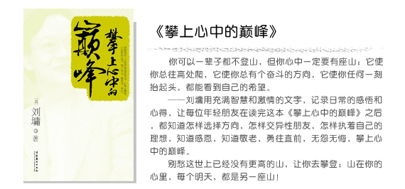 你可以一輩子都不登山,但你心中一定要有座山。它使你總往高處爬,它使你總有個奮斗的方向,它使你任何一刻抬起頭,都能看到自己的希望。 《攀上心中的巔峰》就是為年輕人寫的。正因為寫給“年輕的你”,所以既把你往回拉,叮囑你好好準備行囊、接受訓練;也把你往外推,告訴你:“你要走自己的路,成為你自己!