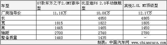 從上面的表中我們可以看出,賓悅的價格比F6整整多出了2萬多元,很明顯,沒有什么理由讓消費者去多掏那2萬元。從車身尺寸對比可以看處,賓悅是三者中擁有最長車身的車型,而身高和寬度上比亞迪更勝一籌。軸距上的優勢使賓悅的內部乘坐空間相對其他兩款車型會好點,穩定性好了,轉向靈活性就會相應的差點。質量的多少賓悅雖然沒有公布出來,但是從各數據可以判斷出,賓悅的整備質量應該是三款車型中是最重的,無疑也是對油耗影響最大的。