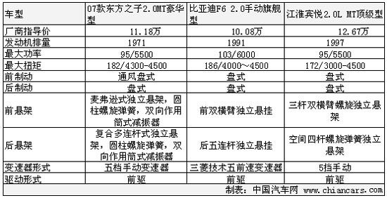 從表中對比我們看出,動力性能F6最強,最大功率103千瓦,最大扭矩186牛米。剩余兩款車最大功率完全一致,最大扭矩依次為東方之子182牛米,賓悅172牛米,均集中在4500轉為最大值。前后制動都是采用盤式,驅動形式也都采用了前驅驅動。