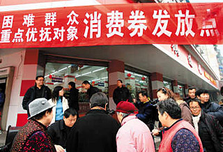 | 成都金牛區撫琴社區的部分困難群眾正在領取成都市發放的消費券。CFP供圖 | 價值3791萬元的消費券,發放給30余萬困難群眾,能否達到刺激消費、擴大內需的政策效果?成都市發放消費券的措施,近日引起了社會廣泛關注。