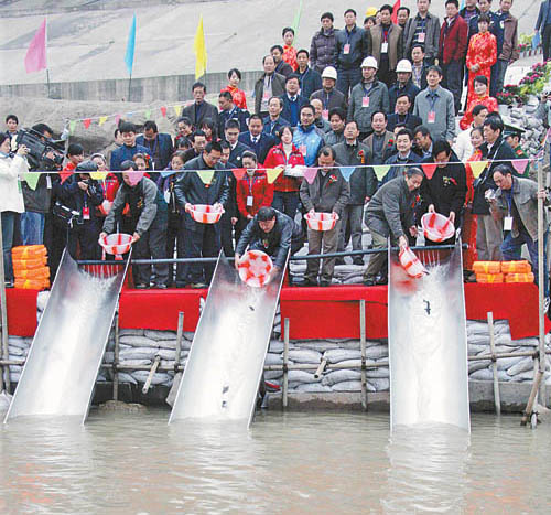2008年12月7日上午,四川宜賓,中國三峽總公司在向家壩水電站施工區金沙江邊舉行“金沙江溪洛渡向家壩水電站珍稀特有魚類首次放流活動”。 CFP供圖