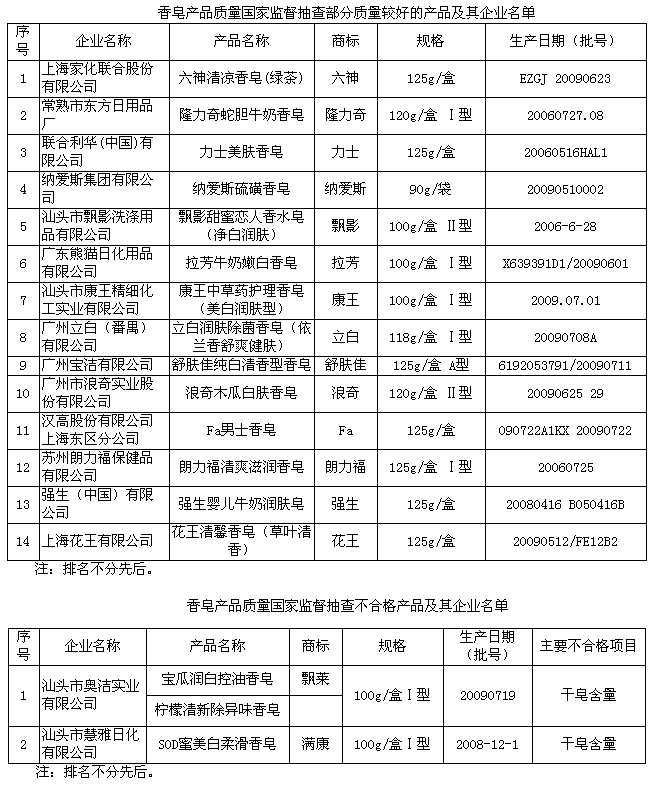 據國家質檢總局網站,國家質檢總局日前對香皂產品質量進行國家監督抽查,產品抽樣合格率達95.9%。 本次抽查覆蓋北京、上海、江蘇、浙江、安徽、吉林、湖北、廣西、廣東等9個省和直轄市,共抽查了43家企業生產的73種產品。抽查中發現的主要質量問題是香皂中的干皂含量未達到標準要求。