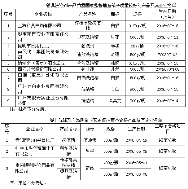 據悉,抽查中發現的主要問題有:細菌總數超標,和總活性物含量不穩定。國家質檢總局提醒消費者在選購餐具洗滌劑產品時應注意以下三點:一是到大型的商場、超市購買知名品牌的產品。二是不要購買散裝、標識不全的產品。三是從感官上判斷,應無異味、粘度適中、無分層、無懸浮物。