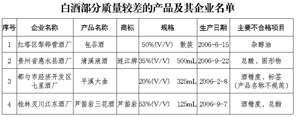 白酒行業抽查出的主要問題有:個別產品雜醇油含量超標;個別產品酒精度達不到明示要求;乙酸乙酯含量不符合標準要求;個別產品總酯達不到標準要求;固形物指標不符合標準要求。