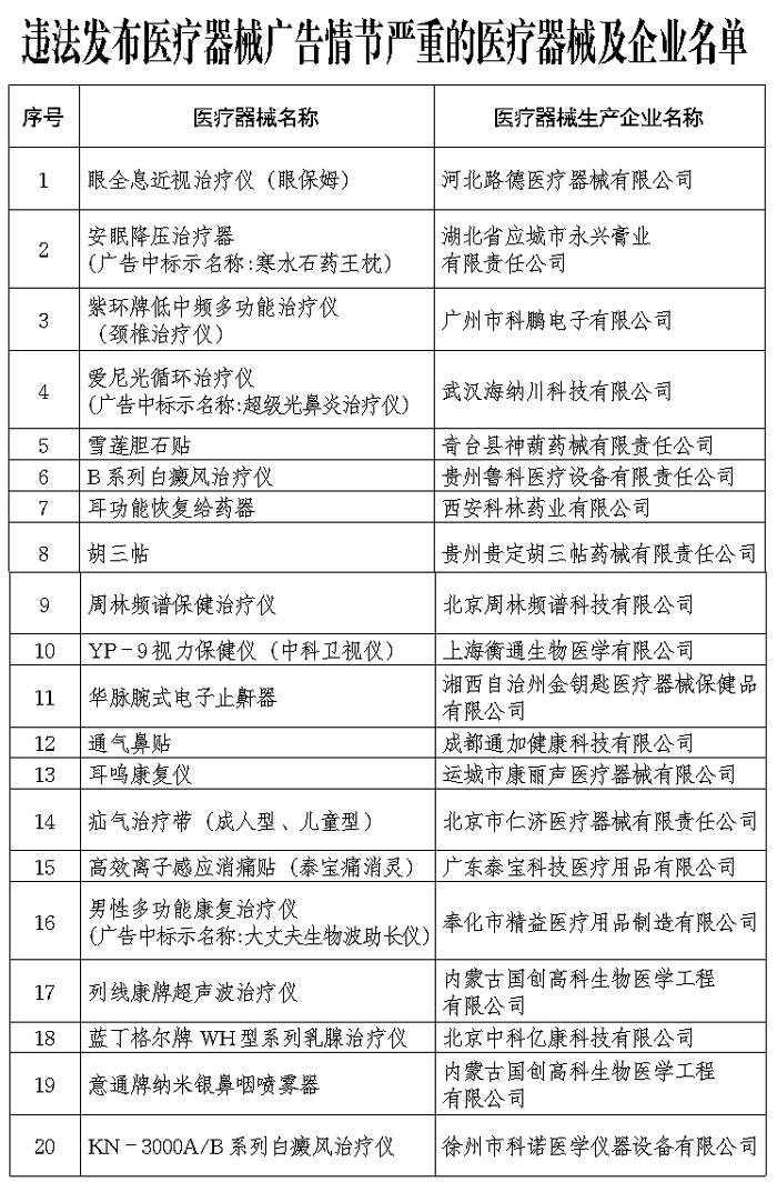 此外,記者了解到,北京周林頻譜科技有限公司生產的“周林頻譜保健治療儀”、上海衡通生物醫學有限公司生產的“中科衛視儀”、湘西自治州金鑰匙醫療器械保健品有限公司生產的“華脈腕式電子止鼾器”、北京中科億康科技有限公司生產的“乳腺治療儀”、內蒙古國創高科生物醫學工程有限公司生產的“意通牌納米銀鼻咽噴霧器”等產品,均存在著未經食品藥品監督管理部門審批發布醫療器械廣告、擅自篡改經食品藥品監督管理部門審查批準的內容發布廣告的情形。這嚴重違反了《廣告法》、《醫療器械廣告審查標準》等規定。